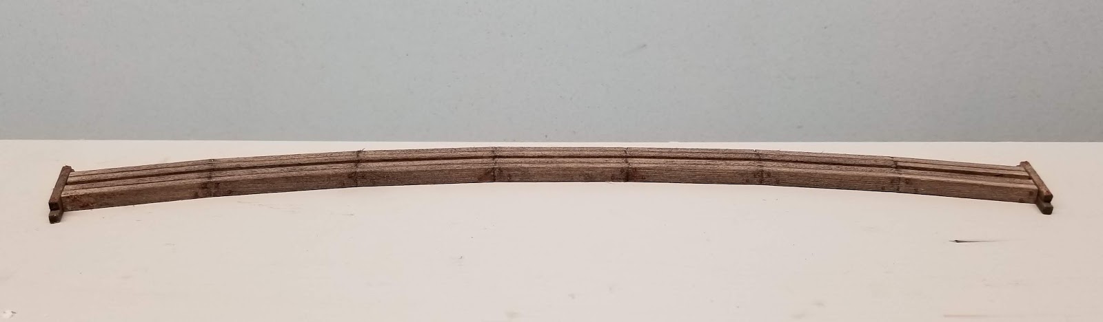 The trestle over the Mill River (which, truth be told, is really more of a creek) will be assembled in place, starting with the stringers and deck and then adding the bents last. Since this is a two-foot-gauge railroad, I only used four stringers, two under each rail. Each stringer is actually a single length of 1/8” x 3/16” basswood (scale 10x16), but since the trestle is on a 21” radius curve, it should have separate stringers running between each bent and angled to follow the curve.